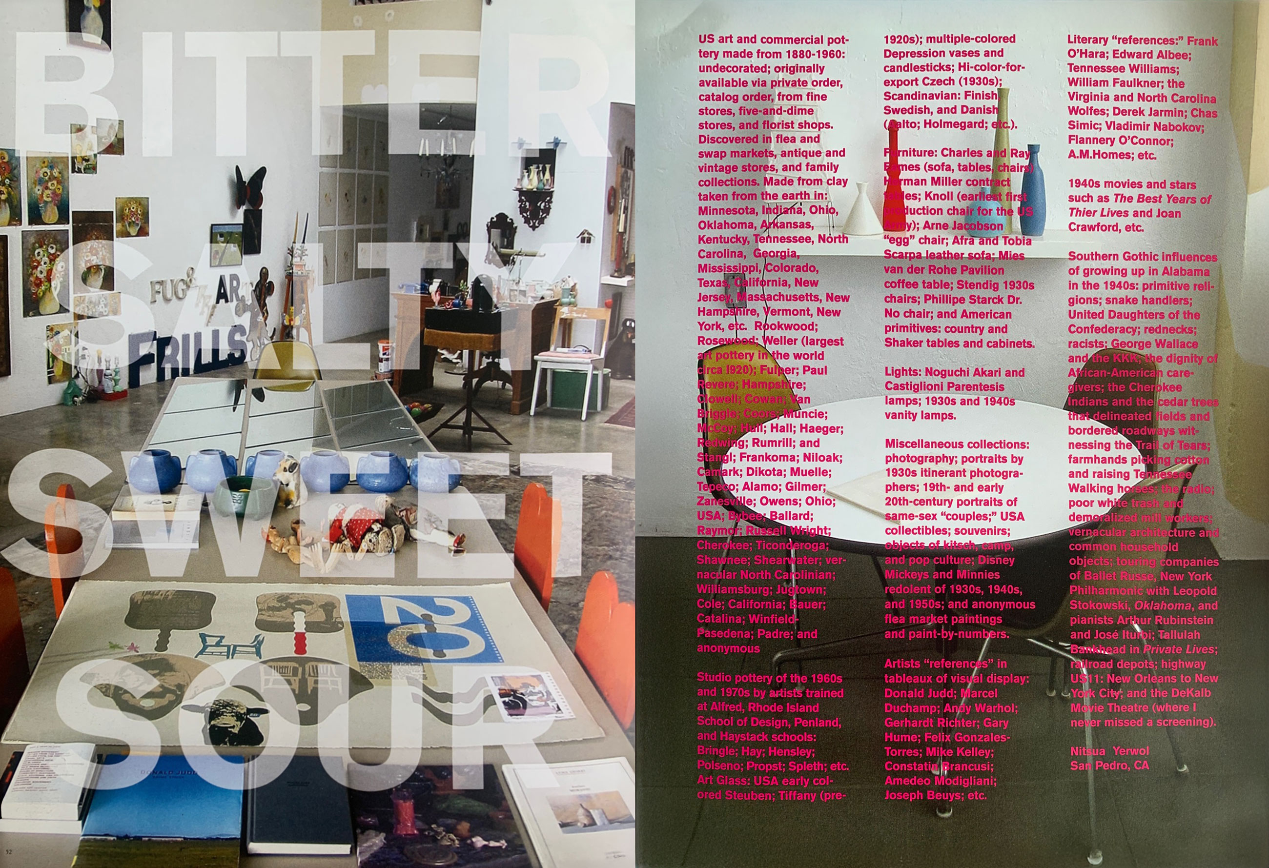 Featured in Sugo 02 ECRITURE INDECISE, Double-page spread design & photos: Andrew Blauvelt, List of collections: Austin Lowrey (Yetwol Nitsua)