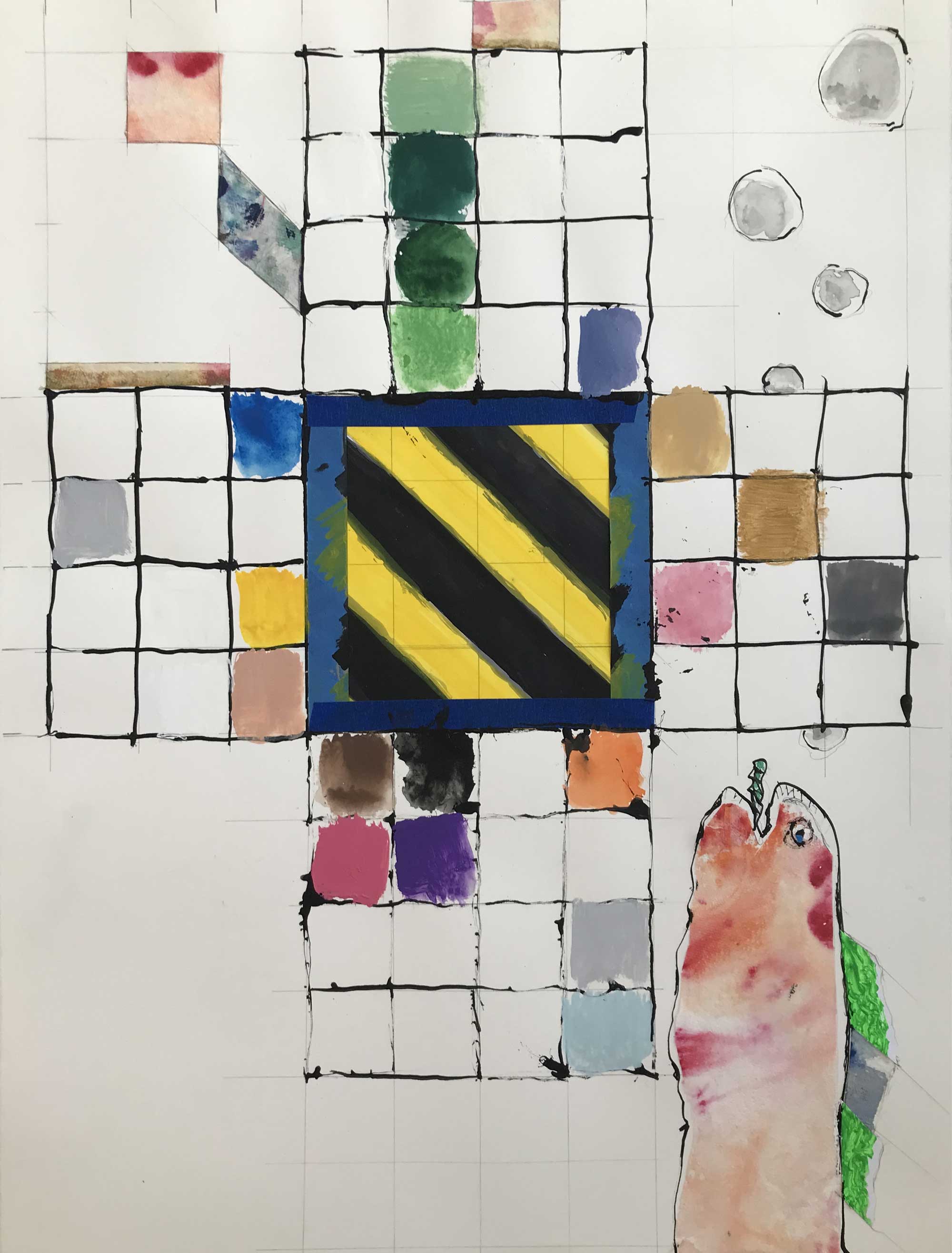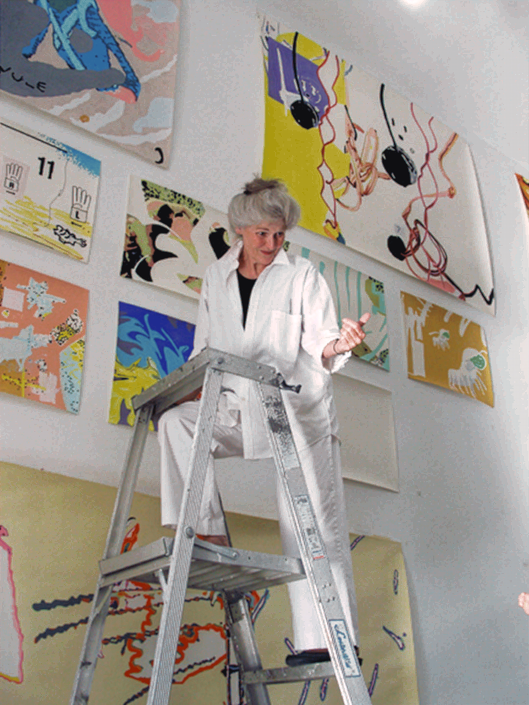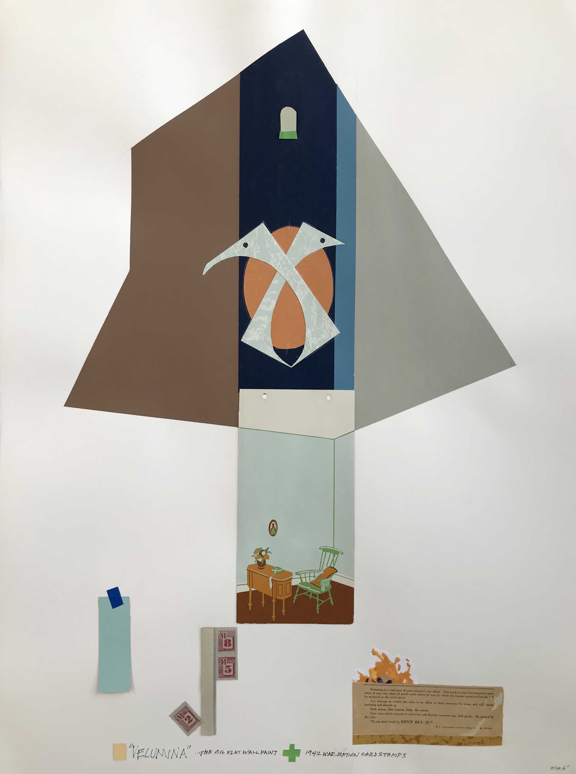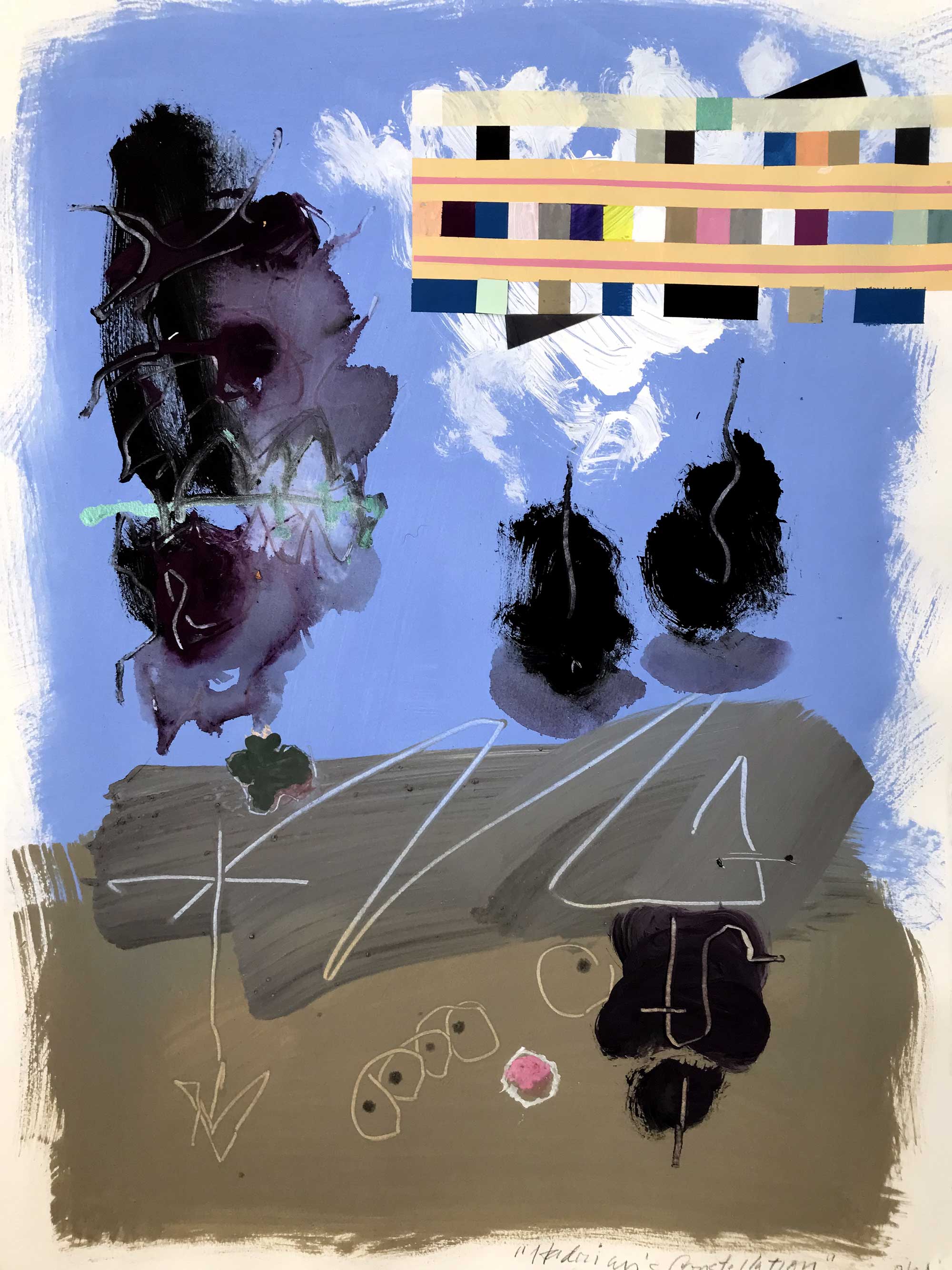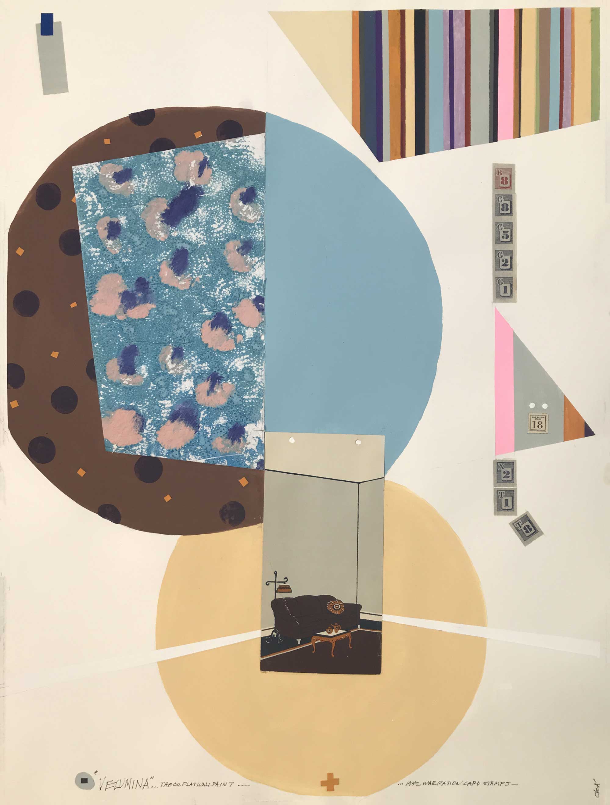 The works are acrylic, collage and mixed media on Arches 220 lb., 22" x 30" (vertical). The titles of those works with titles are important comments on the imagery and humor.
